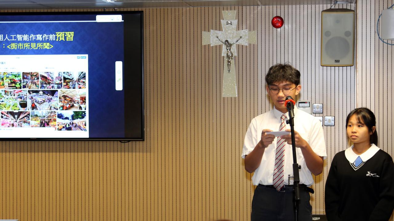 兩位中三級同學向施副局長匯報中國語文科如何運用人工智能提升學生的學習動機和寫作技巧。教師設計預習工作紙,讓學生運用人工智能工具進行寫作前的預習,這不單能延展「學時」,亦能提升學生的自學能力。就如中二級寫作描寫文<街市所見所聞>,學生運用不同人工智能工具生成「聽覺描寫」,老師在課上會展示同學的預習成果,讓同學就生成的「聽覺描寫」作比較和評價。同時,每個中二級學生都備有一本「人工智能使用字典」,當學生寫作任何景物描寫文時,可以依自己的需要輸入指令,並學懂追問,去豐富文章的內容和修辭技巧,做到自主學習。在最後的環節,同學更展示人工智能生成資料的不足之處,學生通過詢問另一人工智能工具、老師意見以及同學討論,去查證資料是否正確,這教導學生運用人工智能的同時,也要抱著「求真求證」的精神。